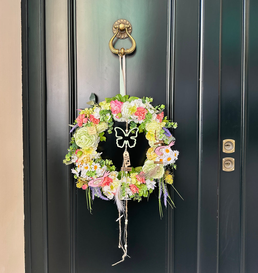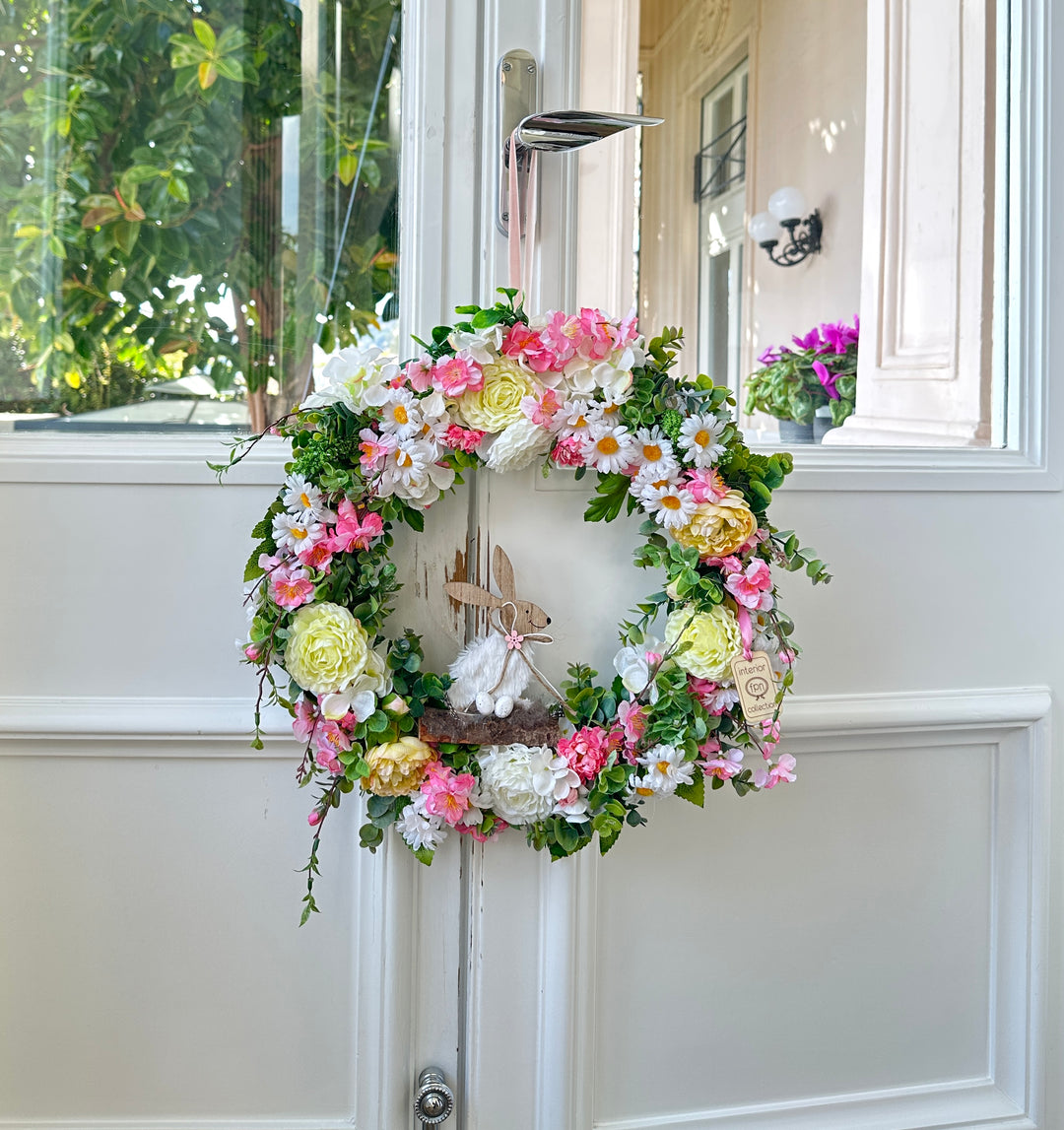 CORONA-PRIMAVERILE REALIZZATA CON FIORI E INSERTI PASQUALI-DIAMETRO 45cm