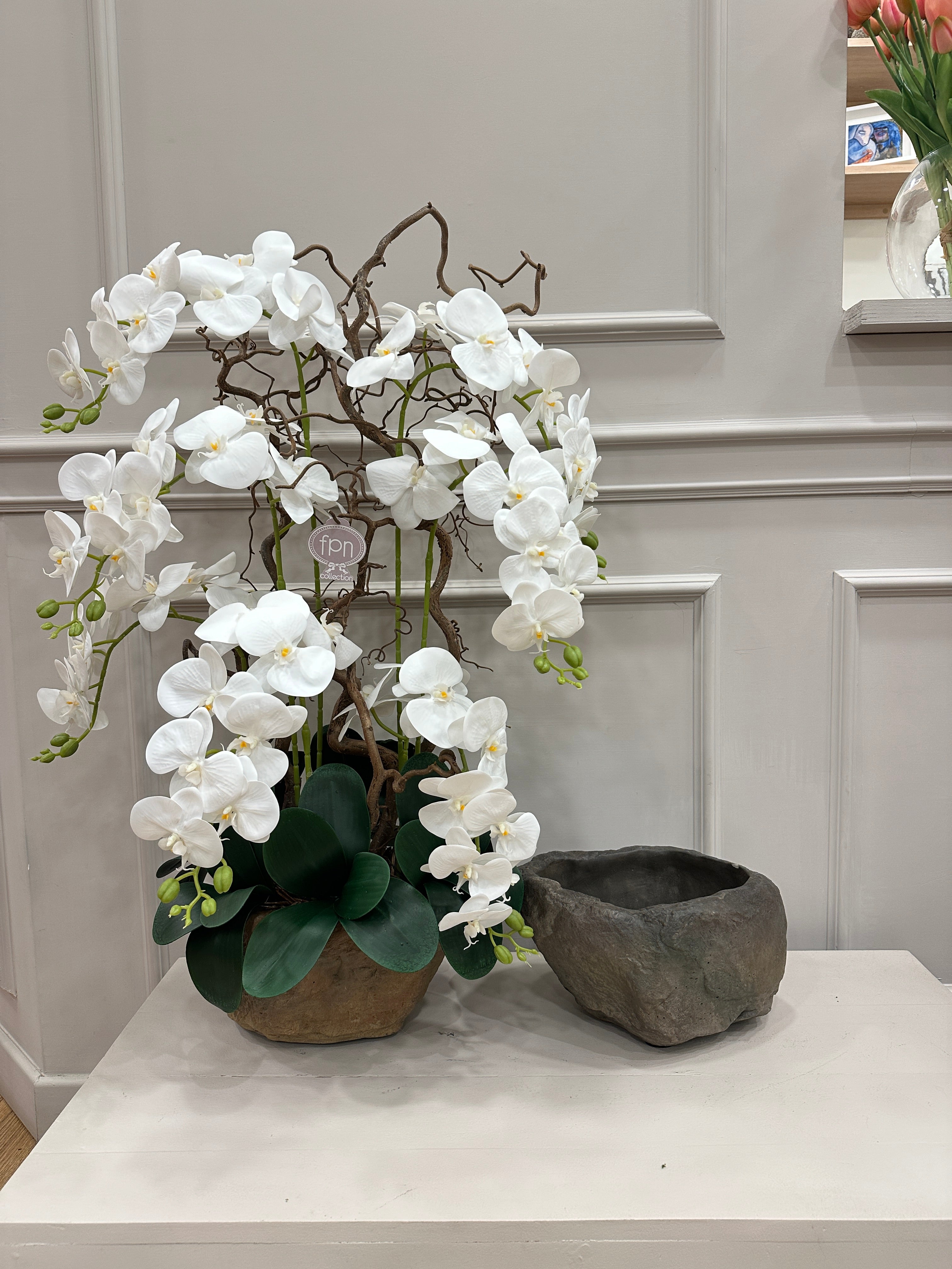 ORCHIDEA-ARTIFICIALE-REAL TOUCH-CON VASO-IN PIETRA -DISPONIBILE IN DUE COLORI-MODELLO A 7 ORCHIDEE-H90cm